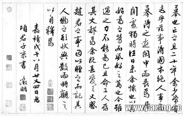 ![]() 文徵明为项元汴书《韩愈画记》(局部) 盛夏时节,曲径通幽的项宅内苍松翠柏、修竹缤纷,引种的几棵芭蕉枝叶茂密,阻隔了烈日的浓焰。此情此景,美酒佳果,文彭不禁想起了南朝沈约的《修竹弹甘蕉文》,于是,他便提议,要为墨林先生留下今日小聚之墨宝。项元汴听后自是大喜,在他看来,文彭的书法,水准堪与其父比肩,是他求之不得的雅物。于是,他嘱家仆速速取来笔墨文房,静候文先生挥毫。文彭书法,篆、分、真、行、草各体俱佳,且每一字体皆有法度,能自成一家,并未蹈袭其父的风格轨迹。他书风多变,起初师法钟繇、王羲之,而后又潜心研习怀素,到了晚年则全身心钻研孙过庭。他完美继承了父亲兼擅诸体的卓越才能,笔力深厚、功底扎实,只可惜,一生都笼罩在父亲盛名光环之下,自身的光芒多少有些被掩盖。 六日之后,文彭再过退密斋,这一次,他又为项元汴作晋代张敏《头责子羽文》。这两件书迹均以草书写成,运笔娴熟有力,结体张弛有度,布局错落有致,颇得孙过庭气韵,项元汴甚是满意。 不日,装裱匠奉上装潢一新的草书册页。项元汴见此,兴致顿生,命人取来文先生为他刻制的斋号印、鉴藏印和数款闲章,以及质地细腻、色泽纯正的上等印泥。他密密麻麻地在这件墨宝上盖下了大大小小七八十方印,可见喜爱之深。这便是今藏于天津博物馆的文彭草书《傲园杂兴册》的来历。 到了闰七月十三日那天,项元汴又得一件珍宝。八十九岁高龄的文徵明,亲自为他作行书司马光《独乐园记》长卷。多年前,备受文徵明器重的仇英,曾在天籁阁住馆多年,为项家作画。其间他既为项元汴摹古,又作订件,精品无数。司马光为著《资治通鉴》,曾在洛阳郊外购地筑“独乐园”。项元汴喜爱这则掌故,曾嘱仇英绘《独乐园图》,以重现司马氏笔意。此画卷已在天籁阁中保存多年,而今有了文老先生的这段书迹,就可谓书画合璧,美轮美奂。不久,这两件作品就被装成一卷。 项元汴似乎对书画合璧情有独钟。再过一月,八月二十四日,文徵明又为天籁阁收藏的沈周《韩愈画记》图卷作书。沈周是文徵明最为敬重的老师,由他作书是再合适不过的了。这一年,文彭也多次应邀为项元汴的藏品作跋。九月二十三日,他为《宋度宗手敕赵子固卷》作跋,十一月二十日,又跋《陆放翁手简二通》。这不过是存世书画题跋上留下的一鳞半爪的线索,或许只是两人频繁往来的冰山一角。 |