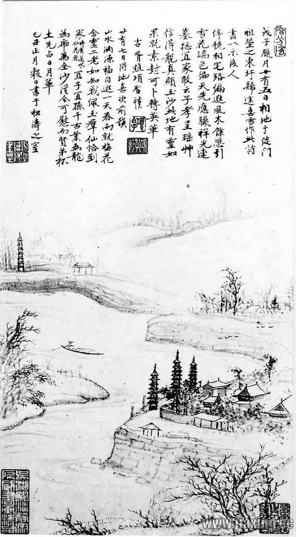 ![]() 明末著名画家项圣谟有一幅《三塔图》,现藏于上海博物馆。《上海博物馆馆藏书画图目》收录这幅画。这幅作品不仅是一件艺术珍品,更是嘉兴历史地理与人文风貌的生动写照。 项圣谟(1597年—1658年),初字逸,后字孔彰,号易庵,别号甚多,有古胥山樵人、鸳湖钓、烟雨楼边钓鳌客等,嘉兴人。 项圣谟出身世家,他自幼受家庭熏陶,祖父项元汴,为明末著名书画收藏家和画家。伯父项德新也善画。项圣谟自幼精研古代书画名作,曾由秀才被举荐为国子监太学生,但不求仕进,沉心于书画,山水、人物、花鸟无一不精。他的山水画早期学习文徵明,进而追摹宋元名家,笔法融会了宋人用笔的周密严谨和元人的空灵韵致,画面意境明净清雅,笔法简洁秀逸极富书卷气。 项圣谟亦精书法,善赋诗。其书法端庄严谨,峻拔出脱。其诗多为题画诗,文辞警策凝重,格调悲壮慨然。国破家亡,晚年家贫,而志存高洁,不交权贵,卖画自给。著有《朗云堂集》《清河草堂集》《历代画家姓氏考》《墨君题语》。自从明朝灭亡后,项圣谟从不在自己的画上署以朝代纪年,仅署干支。 项圣谟这幅《三塔图》,是在清顺治戊子年(1645)51岁时画的,这年的“腊月十有五日”,项圣谟去陡门其祖茔东侧“相地”(通过观察地形、水流、方位等来择地选址),归途喜雪,画了三塔及沿途之景,并赋诗:“停桡相宅路偏遐,风木馀悲引雪花。瑞色遍天先应腊,祥光连墓总宜家。敢云子孝呈瑶草,信得龙真显玉沙。此地有灵如果就,素封可卜转英华。”古胥樵项圣谟,廿有七日得地,喜次前韵:“山水渊源福自遐,一天春雨就梅花。含灵二老如知我,佩玉群仙恰到家(自注:时有送水仙老者)。宜子宜孙千古业,为龙为虎万全沙。从今可慰而贤弟,抔土先占日月华。”第二年“正月穀日”将诗抄于画上。 项圣谟的《三塔图》,真实记录了自己在三塔湾扫墓回来遇雪的情景,并以诗表达了“喜雪”的兴奋心情,因民间称“喜雪”能佑护子孙。因为绘画的实景再现,可以从中看到三百多年前三塔的情景。可以看到运河边保护宝塔的几个石柱。三塔西面不远处还有一座塔,那就是学绣塔。 |