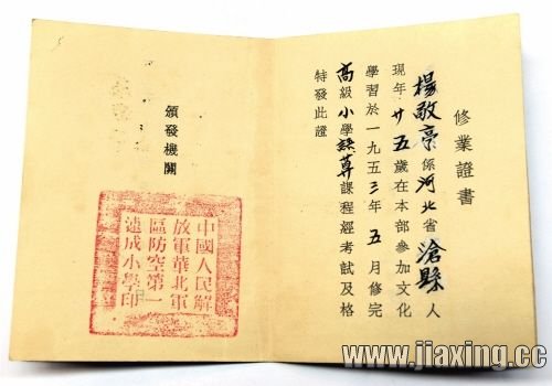 摘要:这是一份1953年的解放军士兵文化学习修业证书,大小如今日的大学毕业证书,只不过,它所能证明的学历只有高小的水平,但是,这并不能抹杀它所体现出的特殊意义。 证书昔日的主人名叫杨敬亭,一名经历过血与火考验的解放军战士。如今,拥有它的是专门从事红色